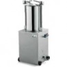 Embutidora hidráulica vertical fabricada completamente de acero inox.Totalmente desmontable para la limpieza sin el empleo de utensilios.Tapa y tapón totalmente de acero inox.Guarniciones de silicona que actúan en el interior del cilindro para una mayor hermetismo y duración de la misma guarnición.Protección hermética del cilindro oleo-dinámico.Vástago del pistón en acero inox.Cilindro de acero inox, lustrado, con bordes redondeados sin lado obligatorio.Potente y silencioso motor ventilado a 2.800 giros de acción inmediata.Retorno del pistón automático con apagado del motor.Mandos a 24 V.Regulador del flujo del aceite de alta precisión.Ruedas de goma opcionales. Tanque de aceite con indicador de nivel.Dimensiones: 565 x 450 x 1160h mmPotencia: 520 wVoltaje: 400/50/3Capacidad cilindro: 25 lts.Longitud cilindro: 460 mmDiámetro cilindro: 260 mmTrayecto pistón: 380 mm Diámetro embudos en dotación: 10-18-25 mm