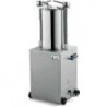 Embutidora hidráulica vertical fabricada completamente de acero inox.Totalmente desmontable para la limpieza sin el empleo de utensilios.Tapa y tapón totalmente de acero inox.Guarniciones de silicona que actúan en el interior del cilindro para una mayor hermetismo y duración de la misma guarnición.Protección hermética del cilindro oleo-dinámico.Vástago del pistón en acero inox.Cilindro de acero inox, lustrado, con bordes redondeados sin lado obligatorio.Potente y silencioso motor ventilado a 2.800 giros de acción inmediata.Retorno del pistón automático con apagado del motor.Mandos a 24 V.Regulador del flujo del aceite de alta precisión.Ruedas de goma opcionales. Tanque de aceite con indicador de nivel.Dimensiones: 640 x 480 x 1160h mmPotencia: 520 wVoltaje: 400/50/3Capacidad cilindro: 35 lts.Longitud cilindro: 460 mmDiámetro cilindro: 320 mmTrayecto pistón: 380 mm Diámetro embudos en dotación: 10-18-25 mm